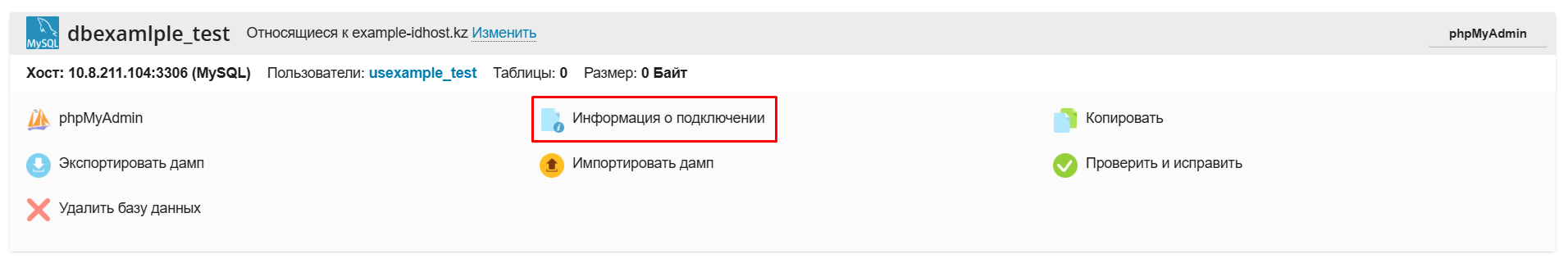 3. Выберите нужную базу данных. Выберите Информация о подключении, чтобы получить данные для подключения.