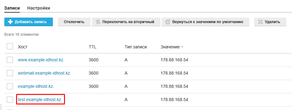 4. Выберите нужную запись и нажмите на имя поддомена (в колонке «Хост»), чтобы внести изменения