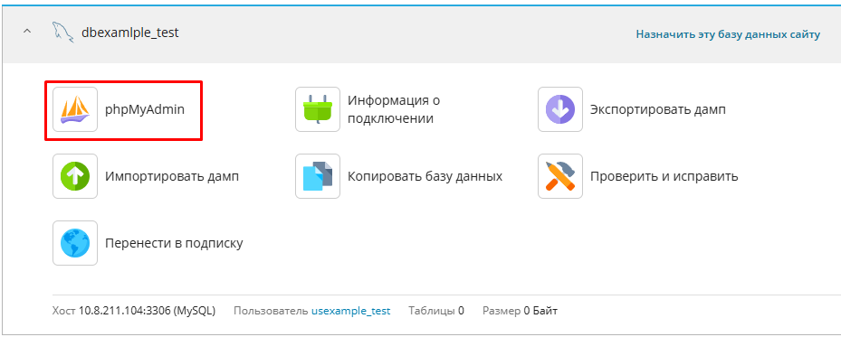 3. В списке доступных инструментов выберите phpMyAdmin для требуемой базы данных.